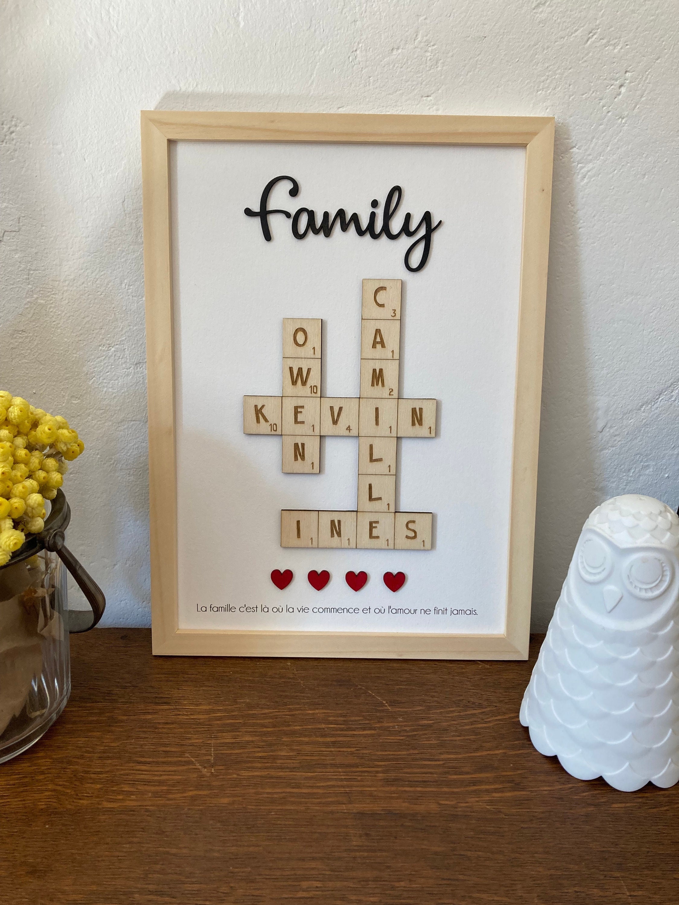 - Ready-to-gift frame: I glue the elements for you! By default, the Family model is made: the word Fmily at the top of the frame + hearts at the bottom.