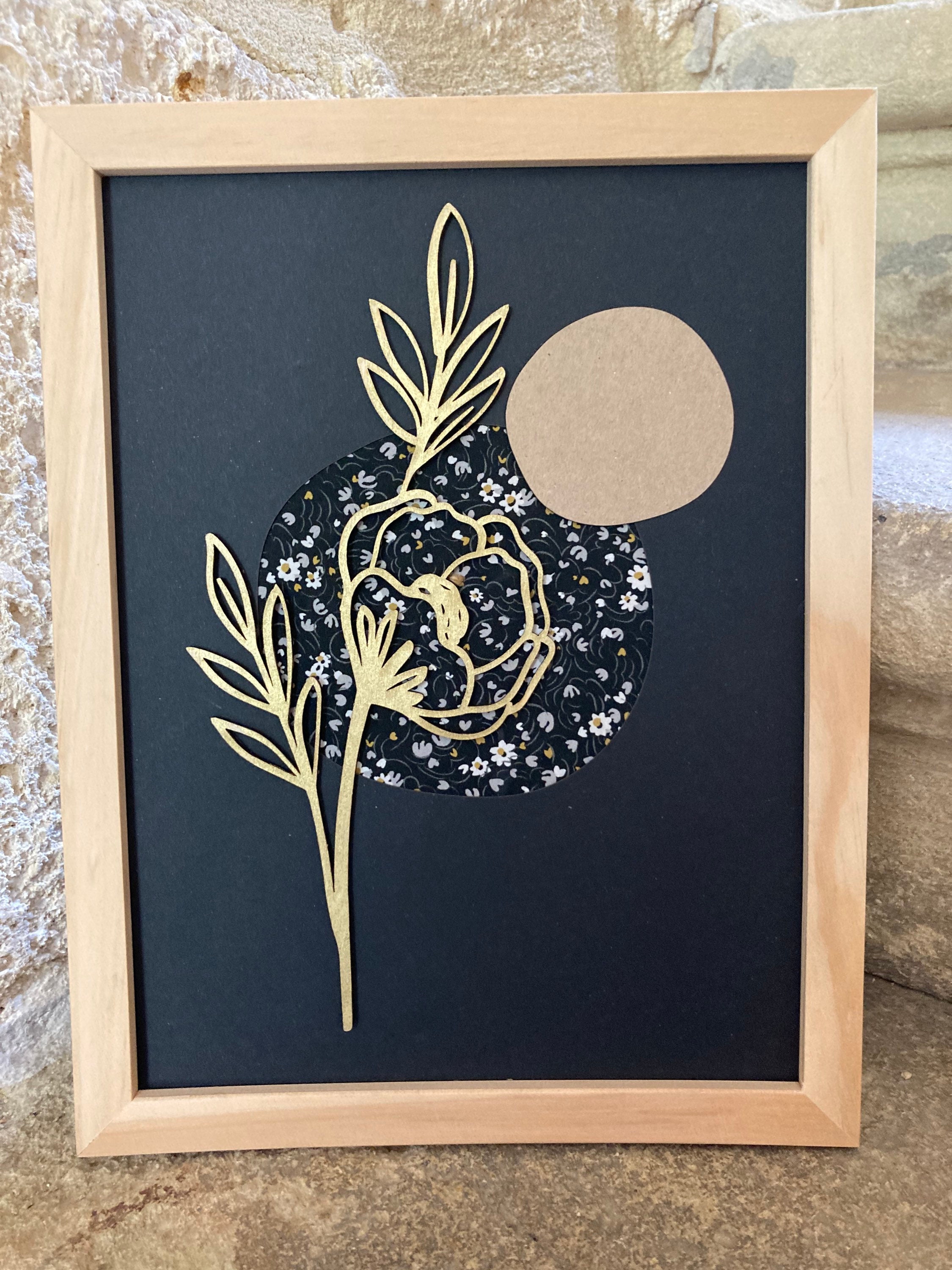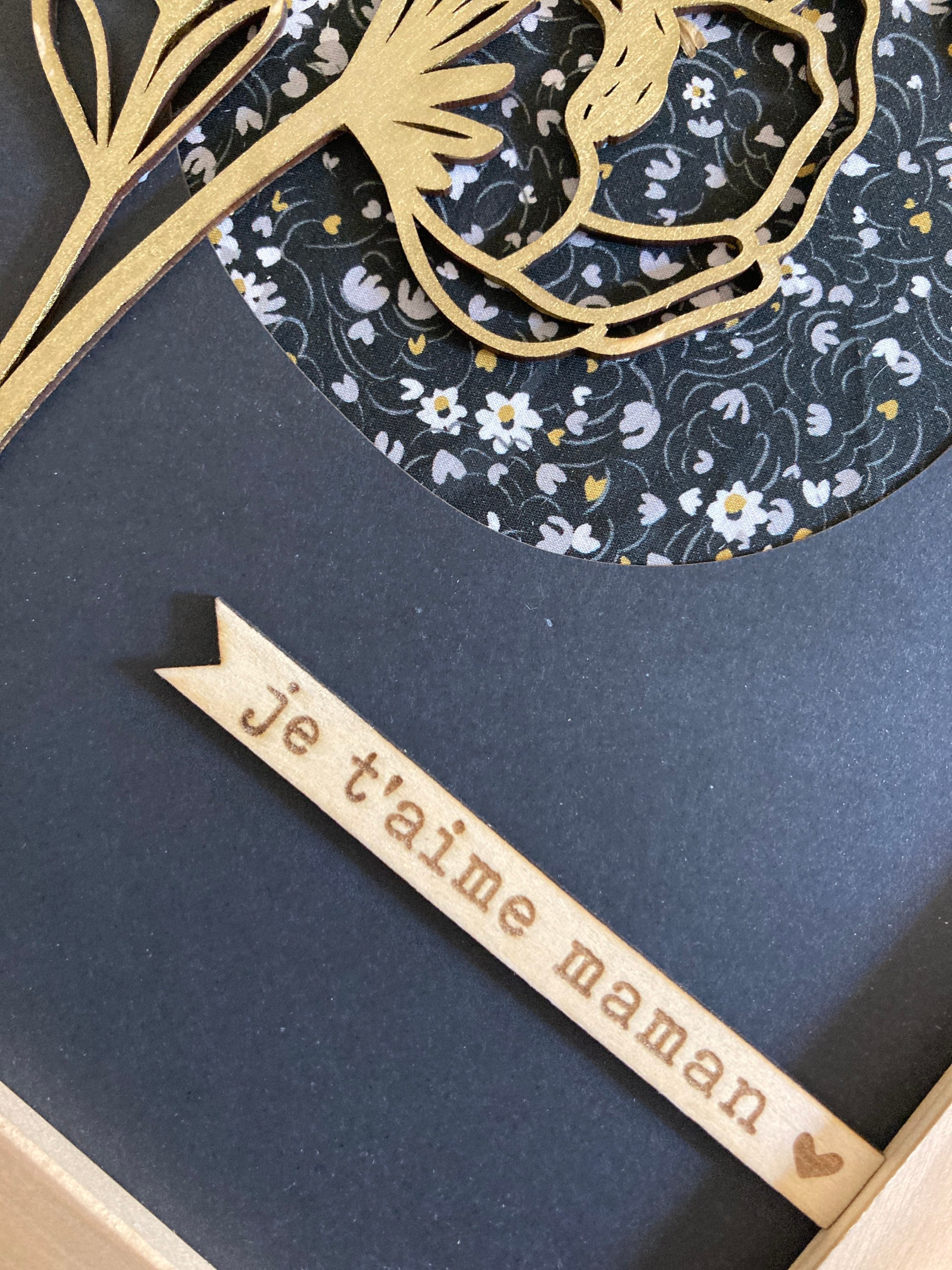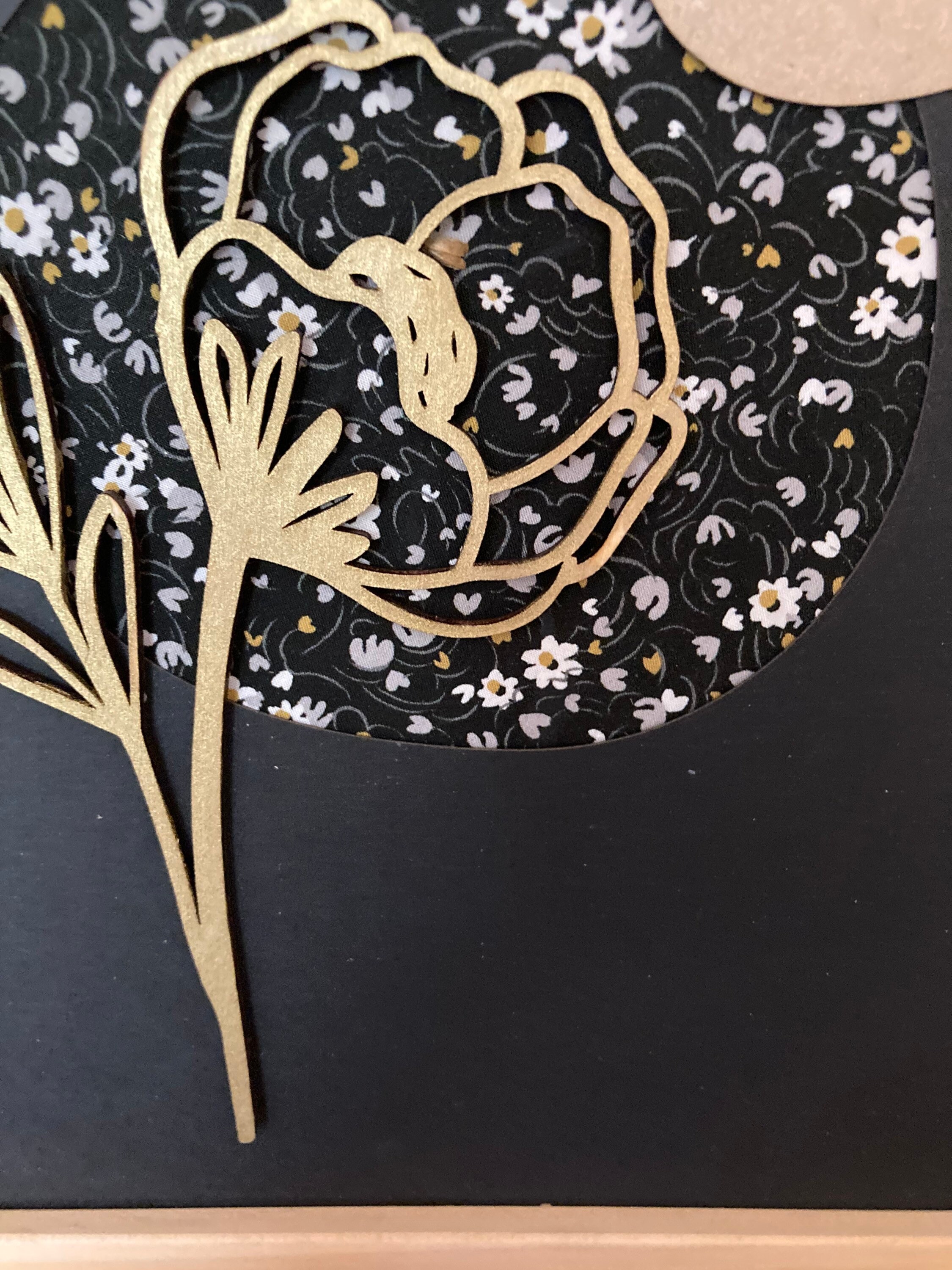Flower in wood and in relief. Liberty style fabrics and paper.
