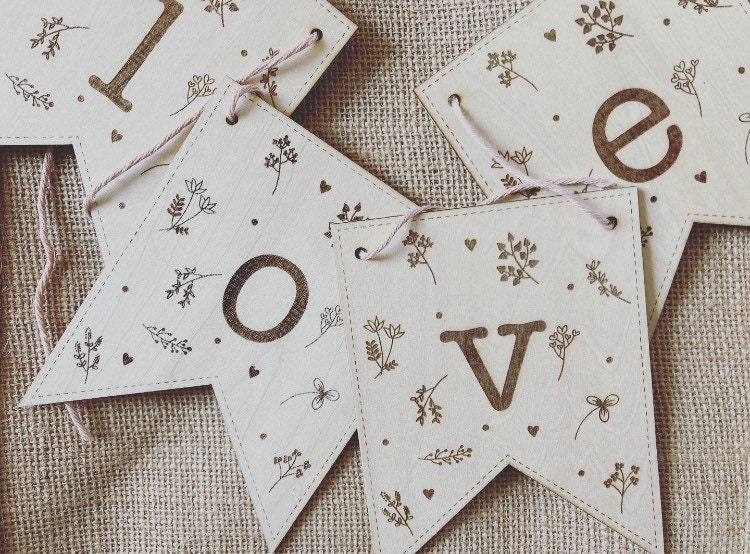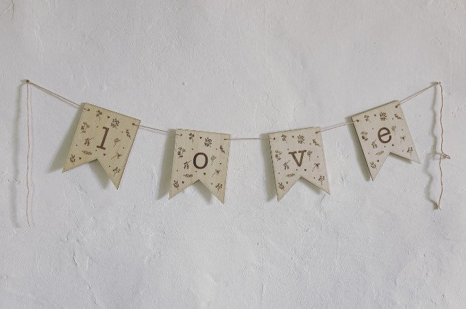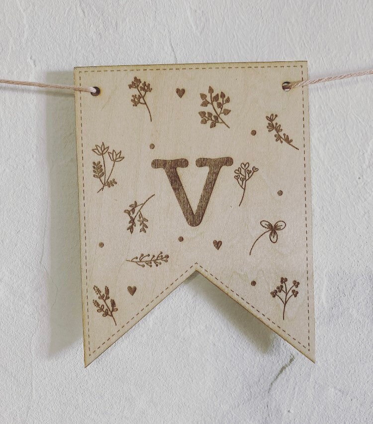 🚩 Engraved wooden pennants with letters of your choice to create a garland.