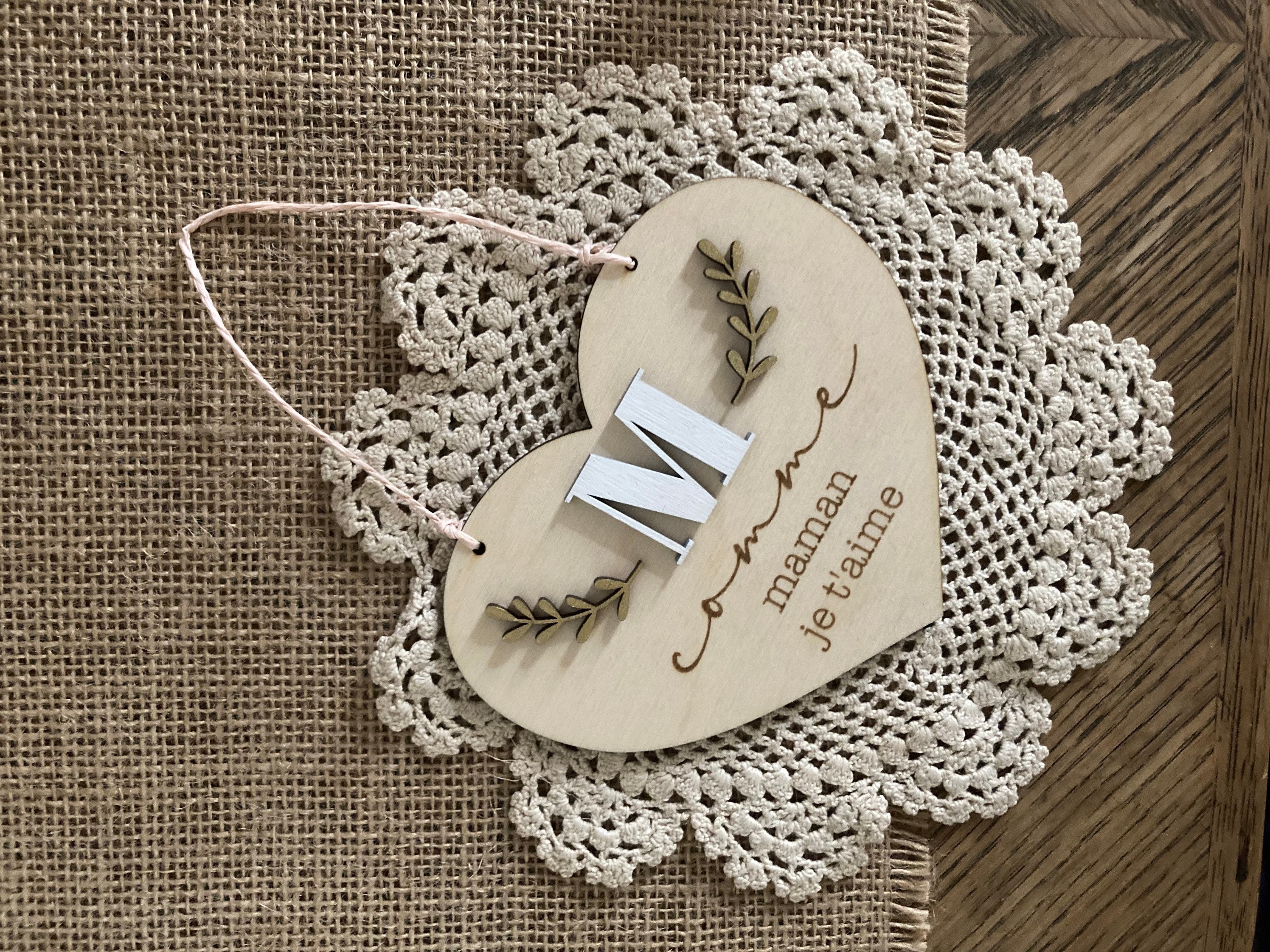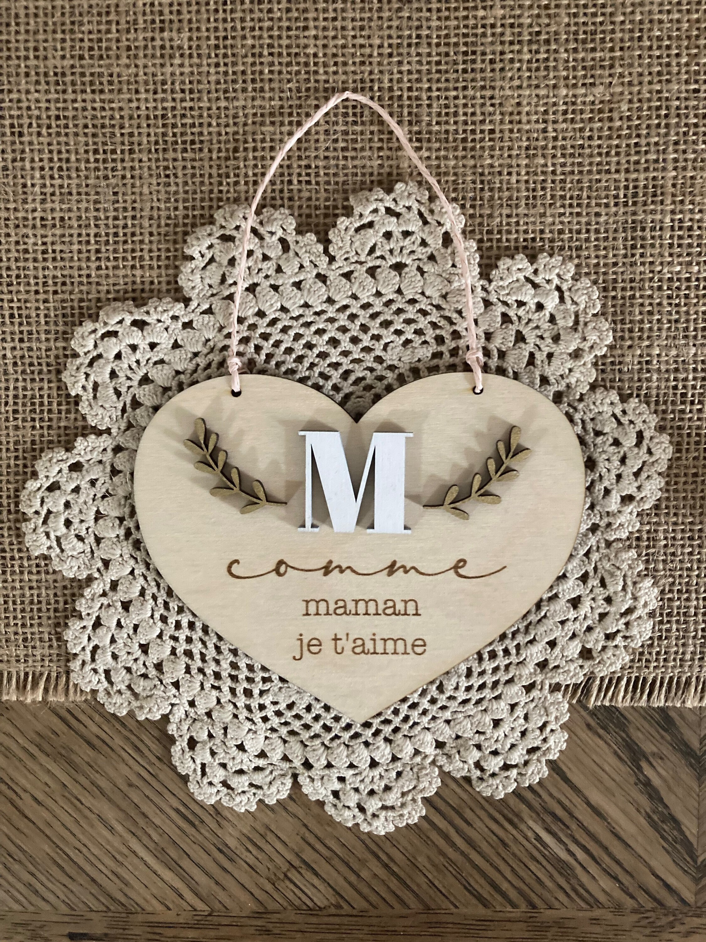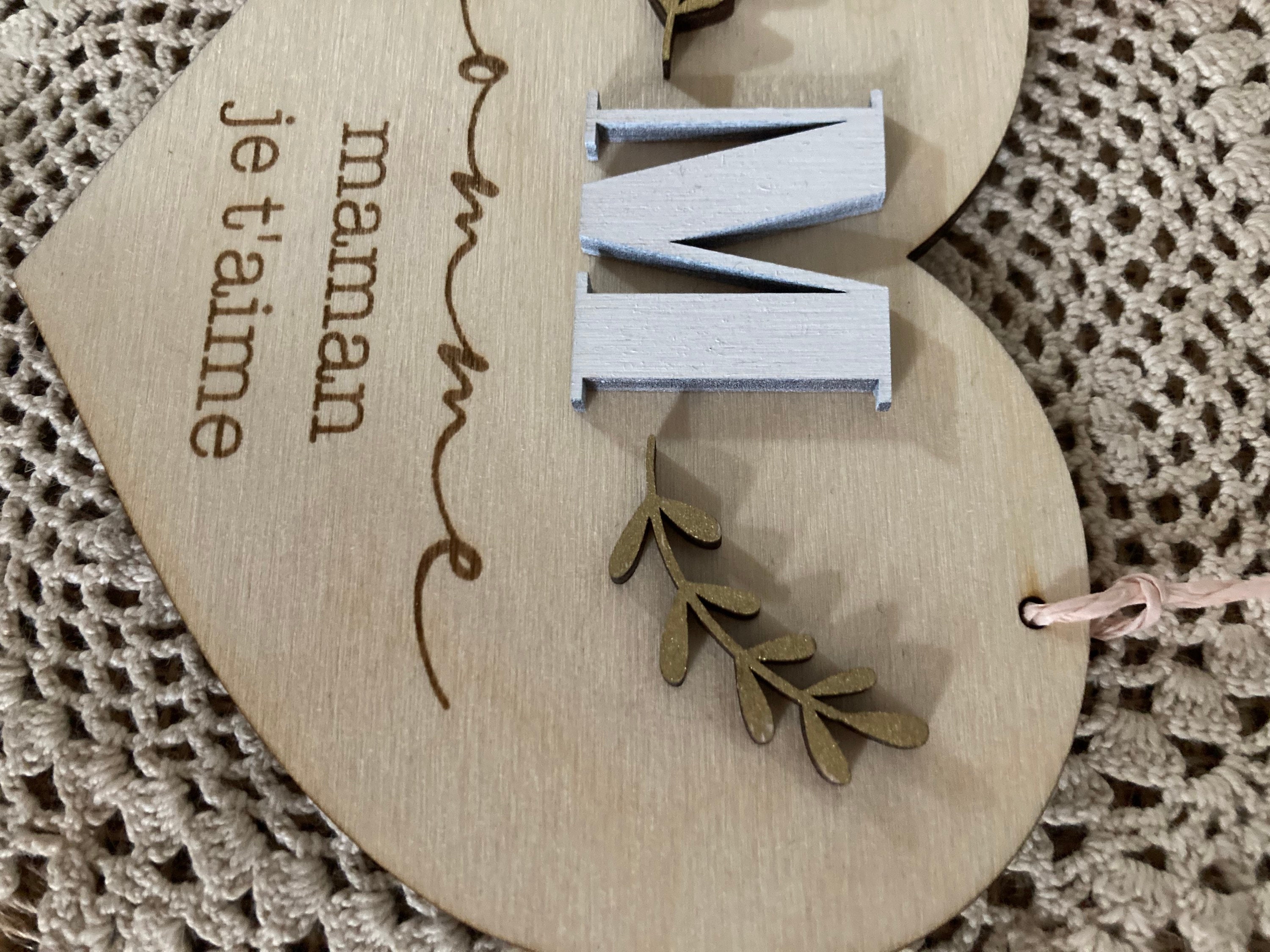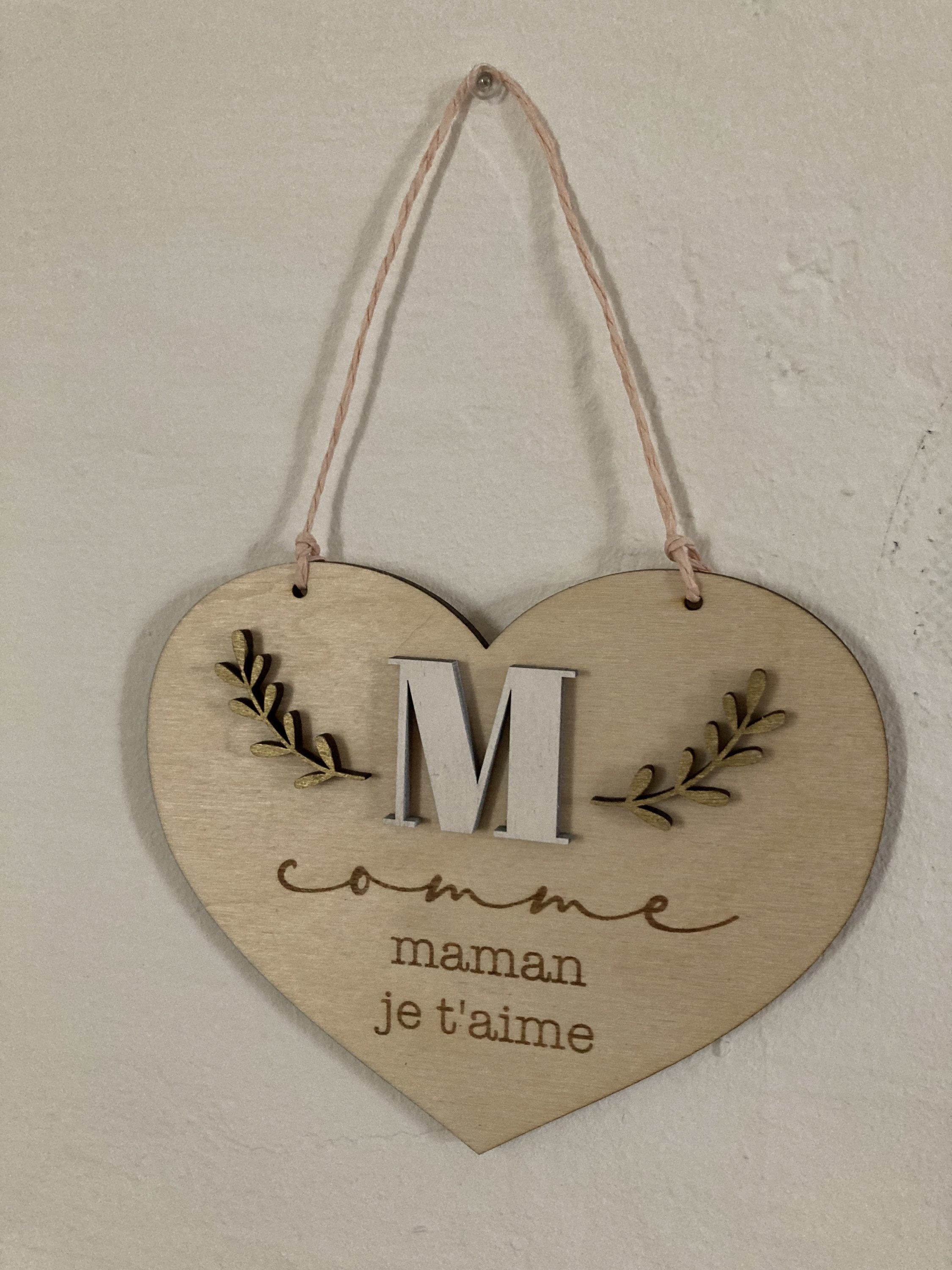 Heart-shaped wooden sign engraved M like Mom I love you...