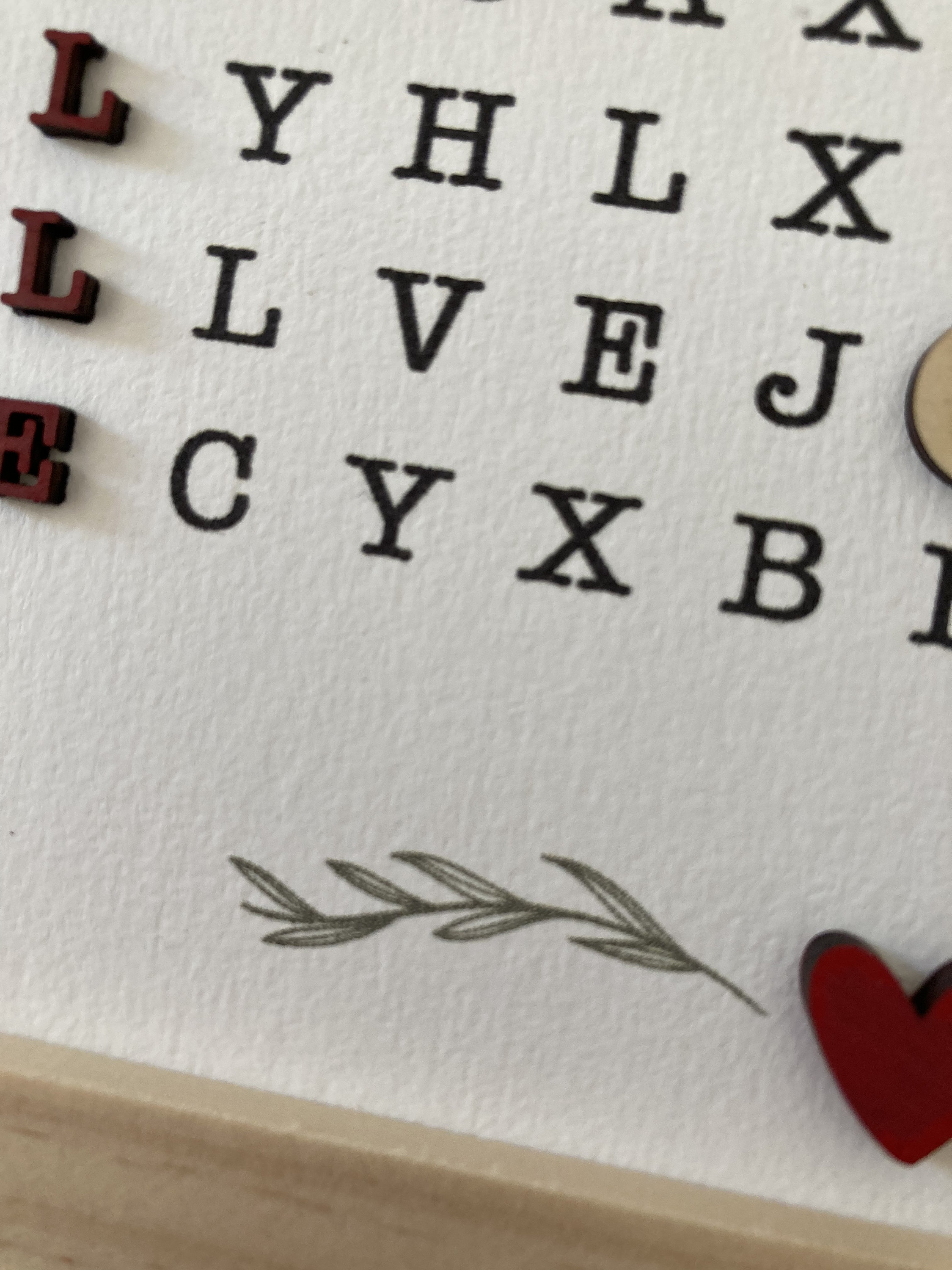 - the words (family, love, etc.) are cut out and painted by hand (in red but other colors on request) and glued.