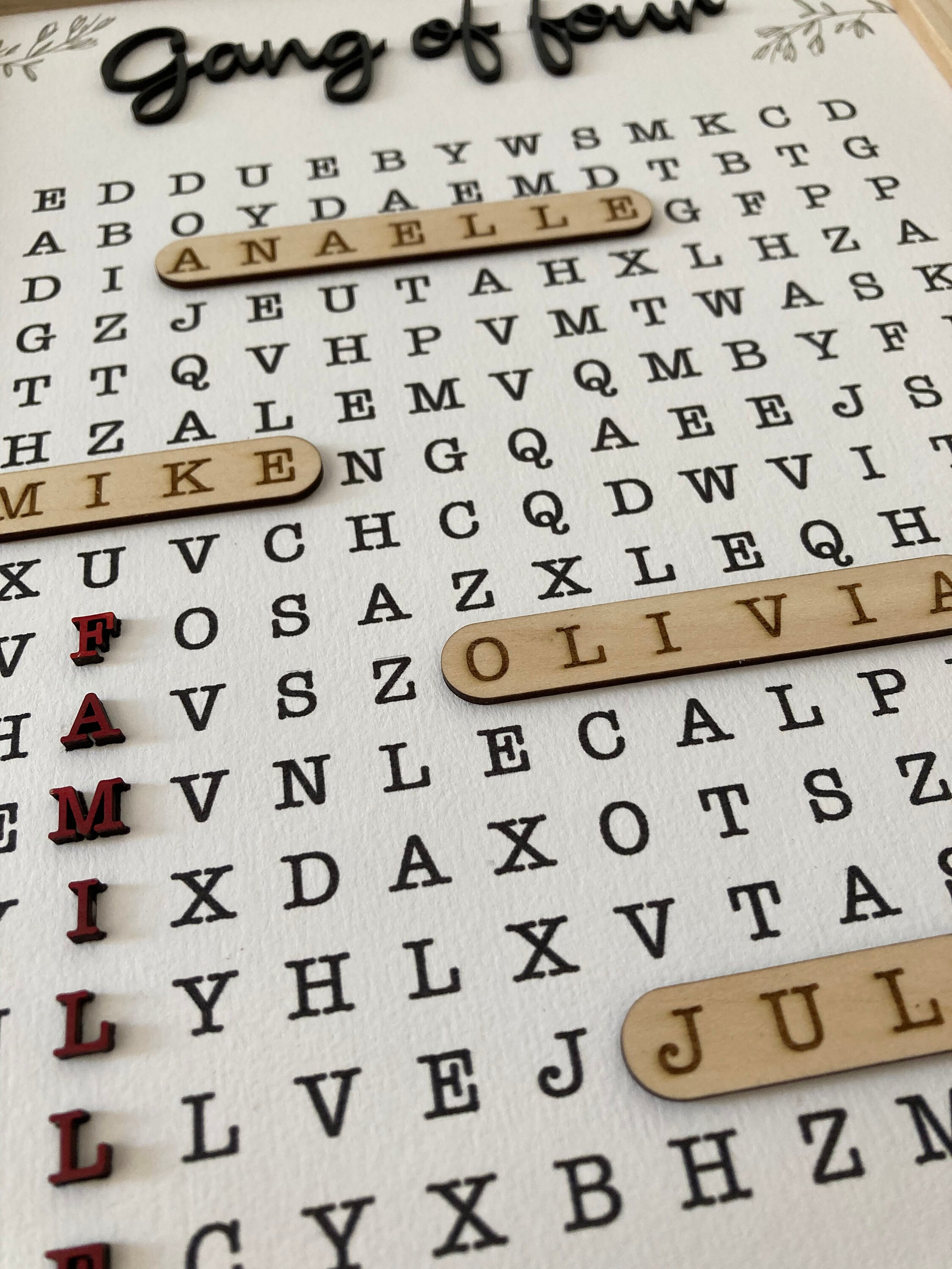 Personalized wood and paper frame - Word search - Family - Personalized poster with the first names of your family members