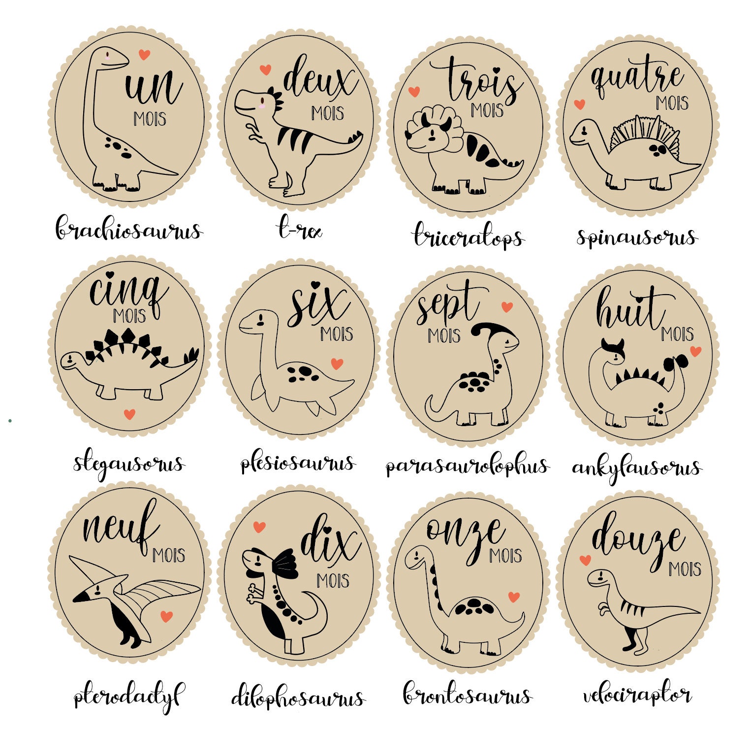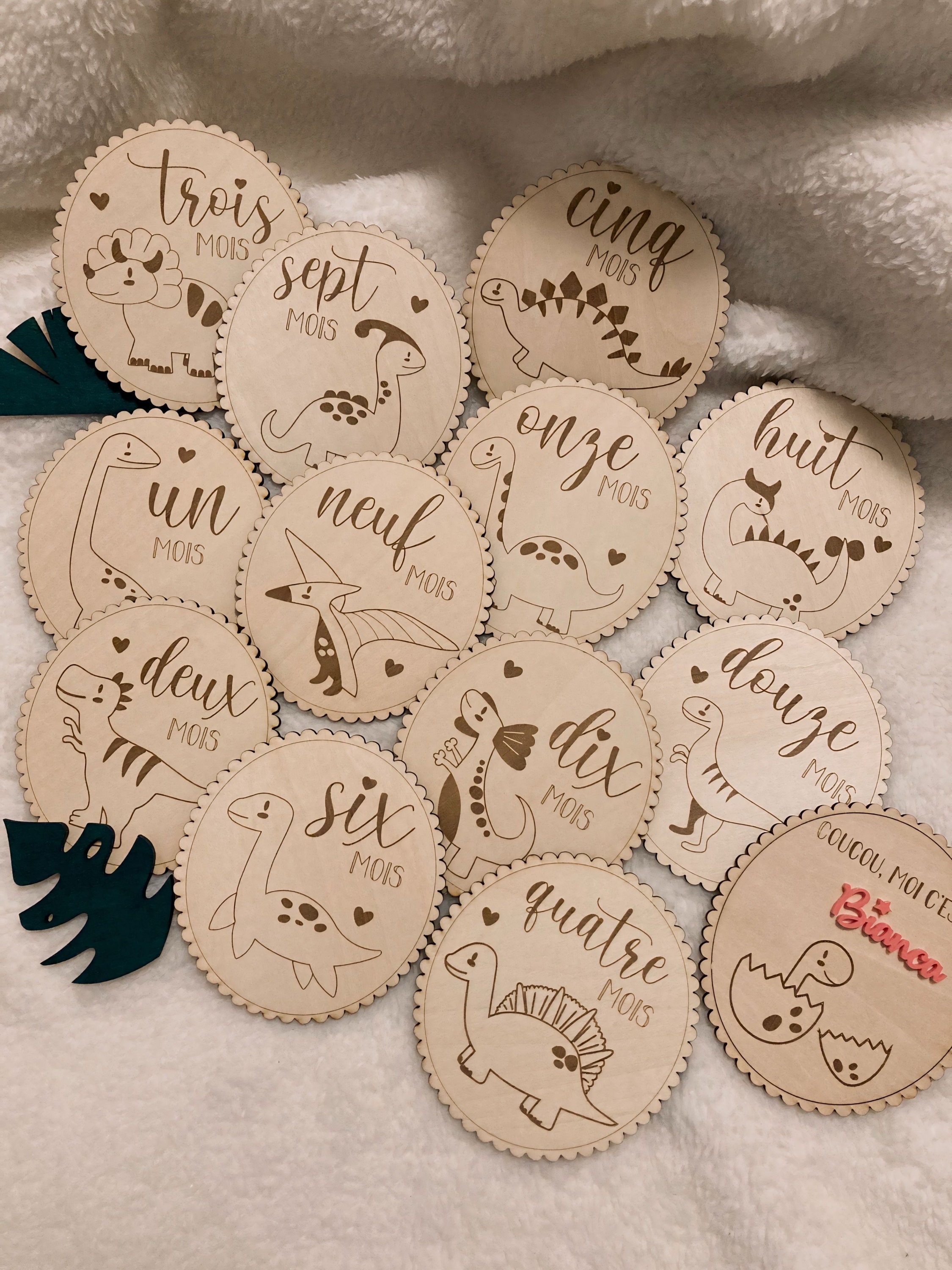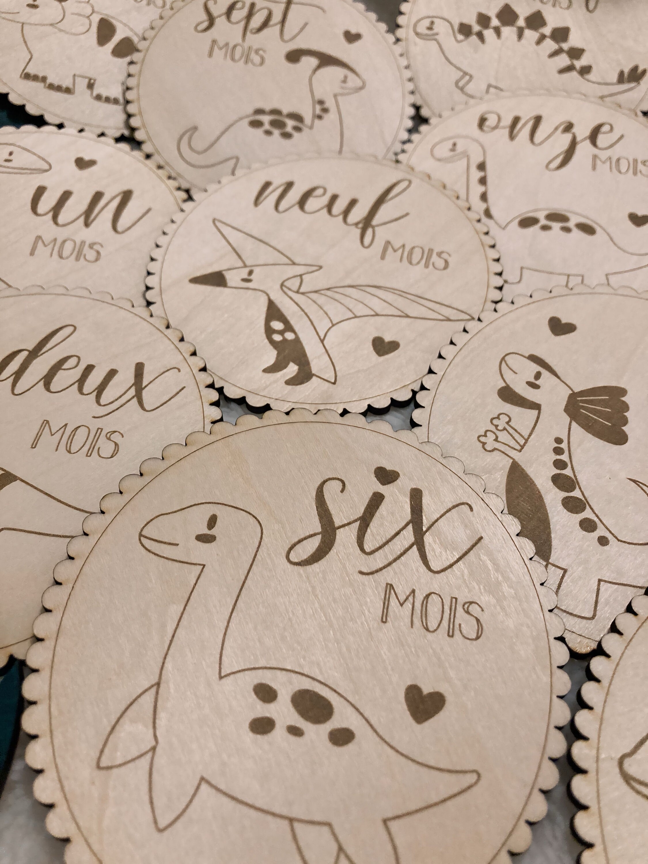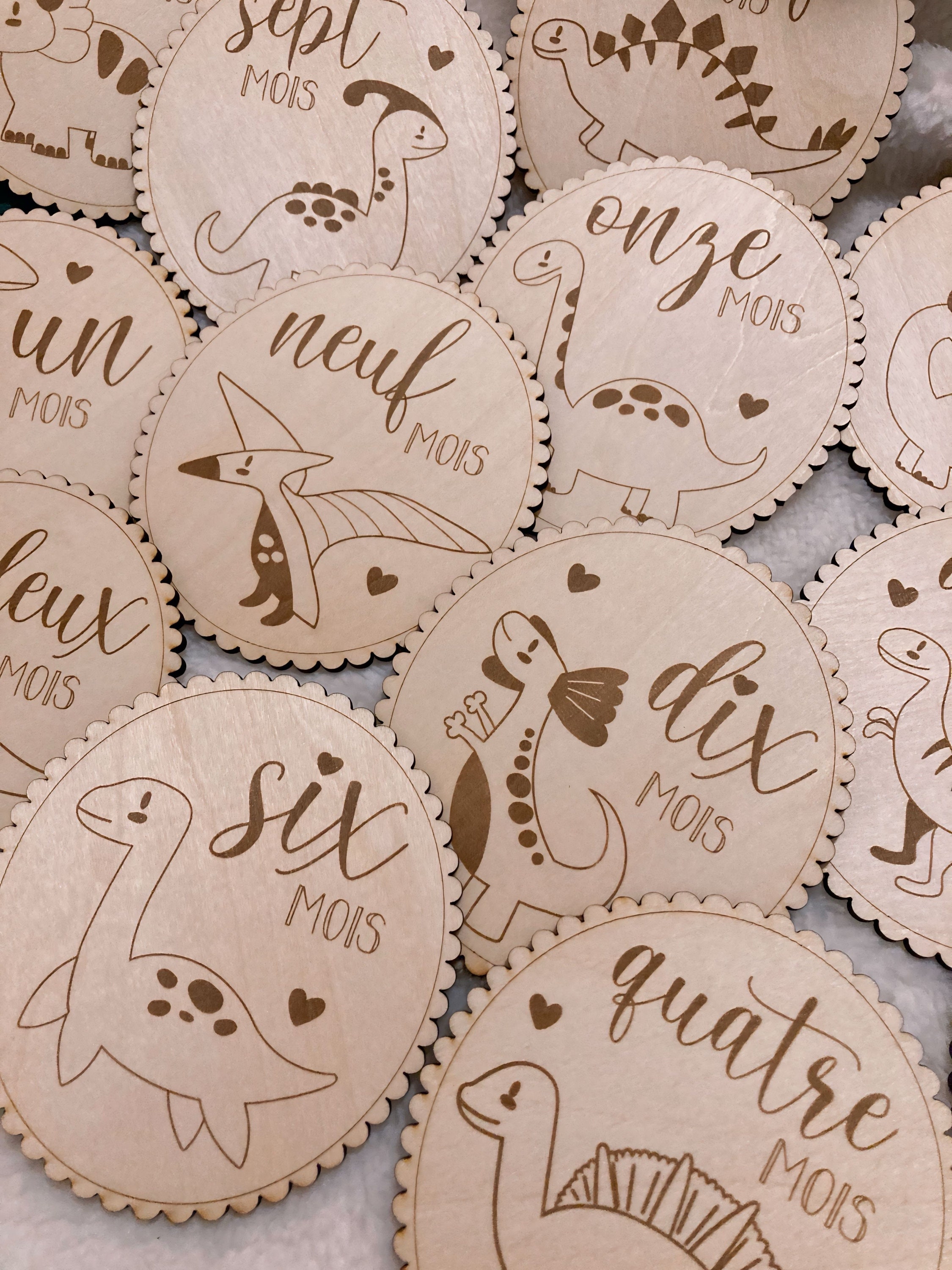 Set of 12 wooden milestone cards on the theme of dinosaurs (1 card per month). There is one card per month, it is not engraved on both sides.